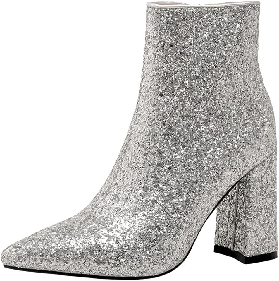 Welcome to Parisuit Store! Style: Glitter Pointed Toe Sparkly Booties Occasions: Daily/Dressing/Festive/Wedding/Party Material: Sequin Heel Type: Chunky High Heel Heel Height: 9cm Platform: 0.5cm Boot Height: 13cm Opening Circumference: 24cm Warm Tips: 1. You will receive your favorite shoes within 10-25 days. 2. If you have any questions, please contact us via email, we will do our best to meet your needs. 3. For more high-quality and favorable shoes, please search for "Parisuit".